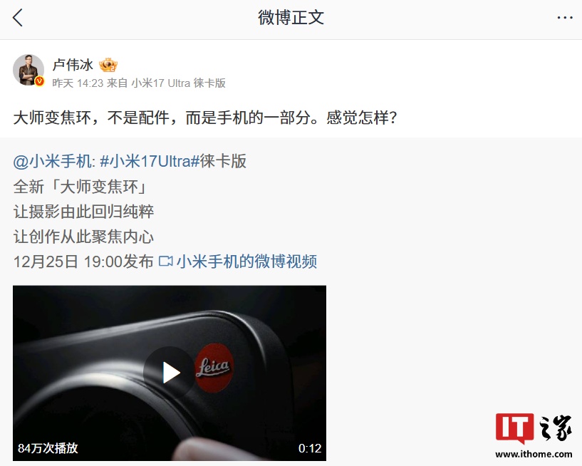 IT之家注意到,小米集团合伙人、总裁,手机部总裁,小米品牌总经理卢伟冰对变焦环进行了简单介绍,称大师变焦环不是配件,而是手机的一部分。
