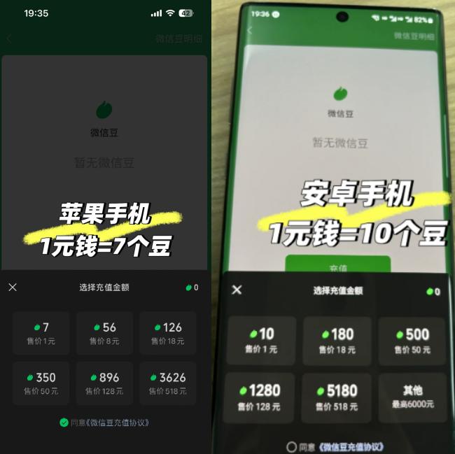 比如,你充值个微信豆,安卓1块钱能买10个,而iPhone 1块钱只能买7个。