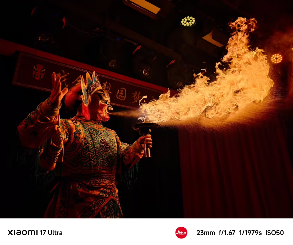 在京剧喷火表演的样张中,火焰的形态被瞬间凝固,细节丰富且富有张力,显示出光影猎人 1050L 传感器的高速快门捕捉能力以及 ISP 极快的吞吐速度。