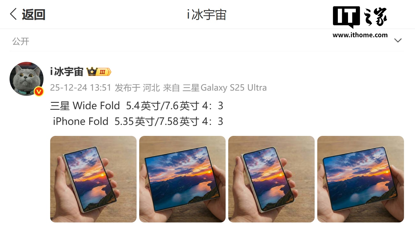 IT之家 12 月 25 日消息,数码博主 @i冰宇宙 昨日(12 月 24 日)发布微博,分享了一组渲染图,对比了三星 Wide Fold 和苹果 iPhone Fold 两款“阔折叠”手机,揭示了两大科技巨头在折叠屏领域的最新博弈。