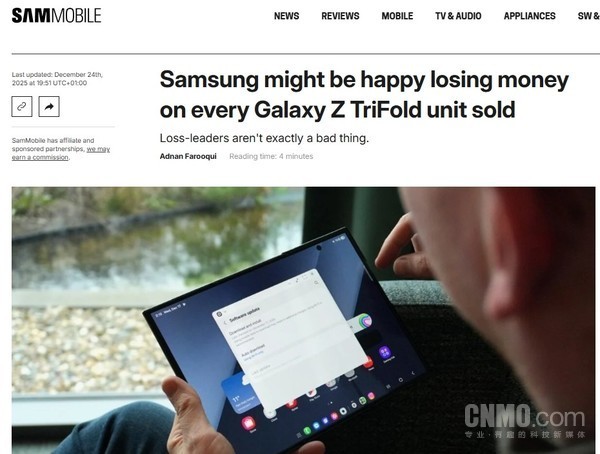 【CNMO科技消息】近日,外媒“SAMMOBILE”分析称,三星可能正在以每台亏损的方式销售其最新的三折叠手机Z TriFold。这并非商业失误,而是一项精心策划的战略,旨在展示其尖端技术实力和市场领导地位,而非追求短期利润。
