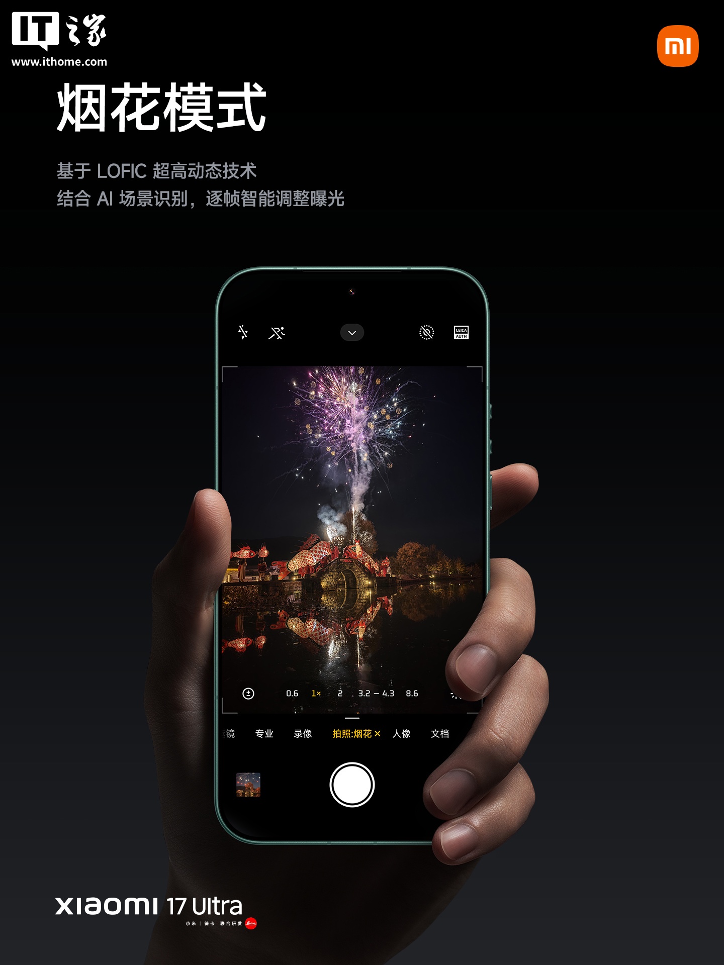 借助 LOFIC 超高动态技术,该机影像系统可从硬件底层提升动态氛围,更能在高反差暗光环境下实现光影细节精准还原且不过曝。官方演示了拍摄烟花的效果,以及烟花下的人像拍摄,可实现高光不过曝、背景纯净,宣称是“烟花神器”。