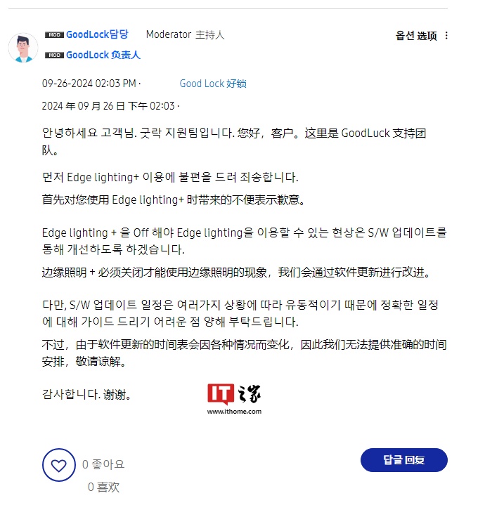 IT之家 9 月 28 日消息,科技媒体 sammyguru 昨日(9 月 27 日)发布博文,报道称三星承认 One UI 6.1.1 更新导致 Edge Lighting+ 应用无法正常运行。