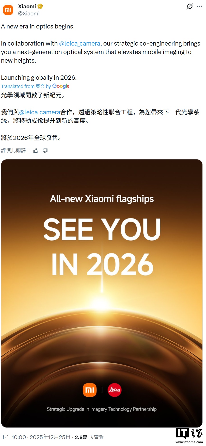 同时,小米官方的 X 平台账号也发布了一张预热海报,宣布全新影像旗舰 17 Ultra 将于 2026 年全球发售。