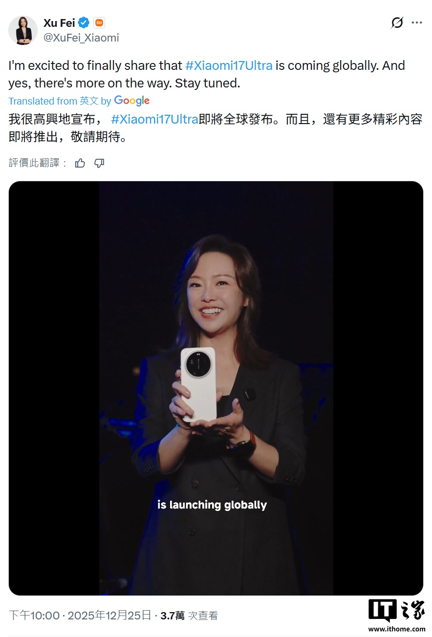 IT之家 12 月 26 日消息,小米集团副总裁许斐昨天在 X 平台发布视频,向海外米粉宣布 17 Ultra 手机将在全球市场发布。