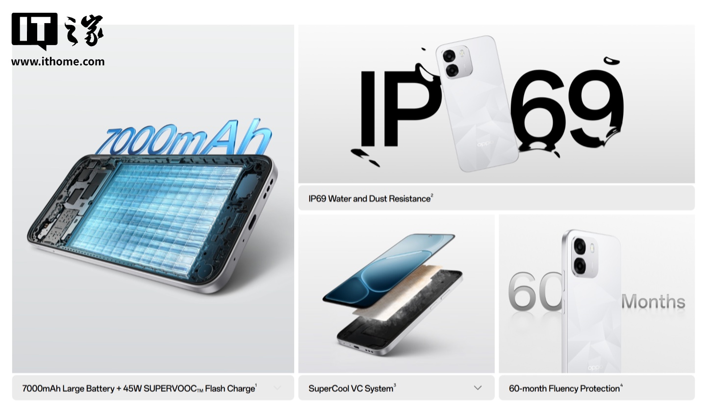 参数方面,这款手机搭载高通骁龙 685 芯片,支持 4G 网络,重量 215 克,厚约 8.61mm,配备 7000mAh 电池,支持 45W SUPERVOOC 有线闪充,符合 IP69 防尘防水标准,拥有 VC 液冷散热系统,配备 8GB 内存、128GB UFS 2.2 存储空间,提供 Crystal White(IT之家注:水晶白)和 Crystal Violet(水晶紫)配色。