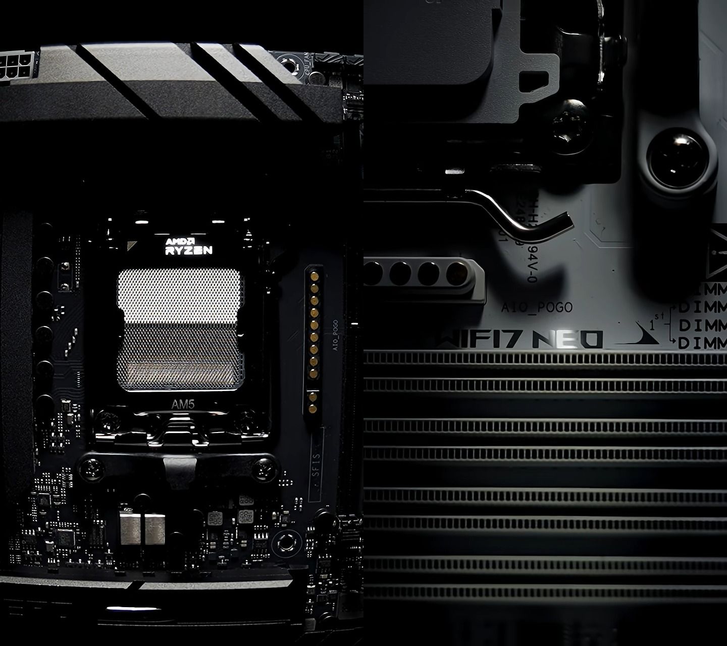 相关主板预计主要基于 AMD AM5 平台,以 "NEO" 为型号尾缀,部分款式在处理器插槽和内存槽中有与特定 AIO 一体式水冷散热器配对的专用 POGO Pin 金属触点。
