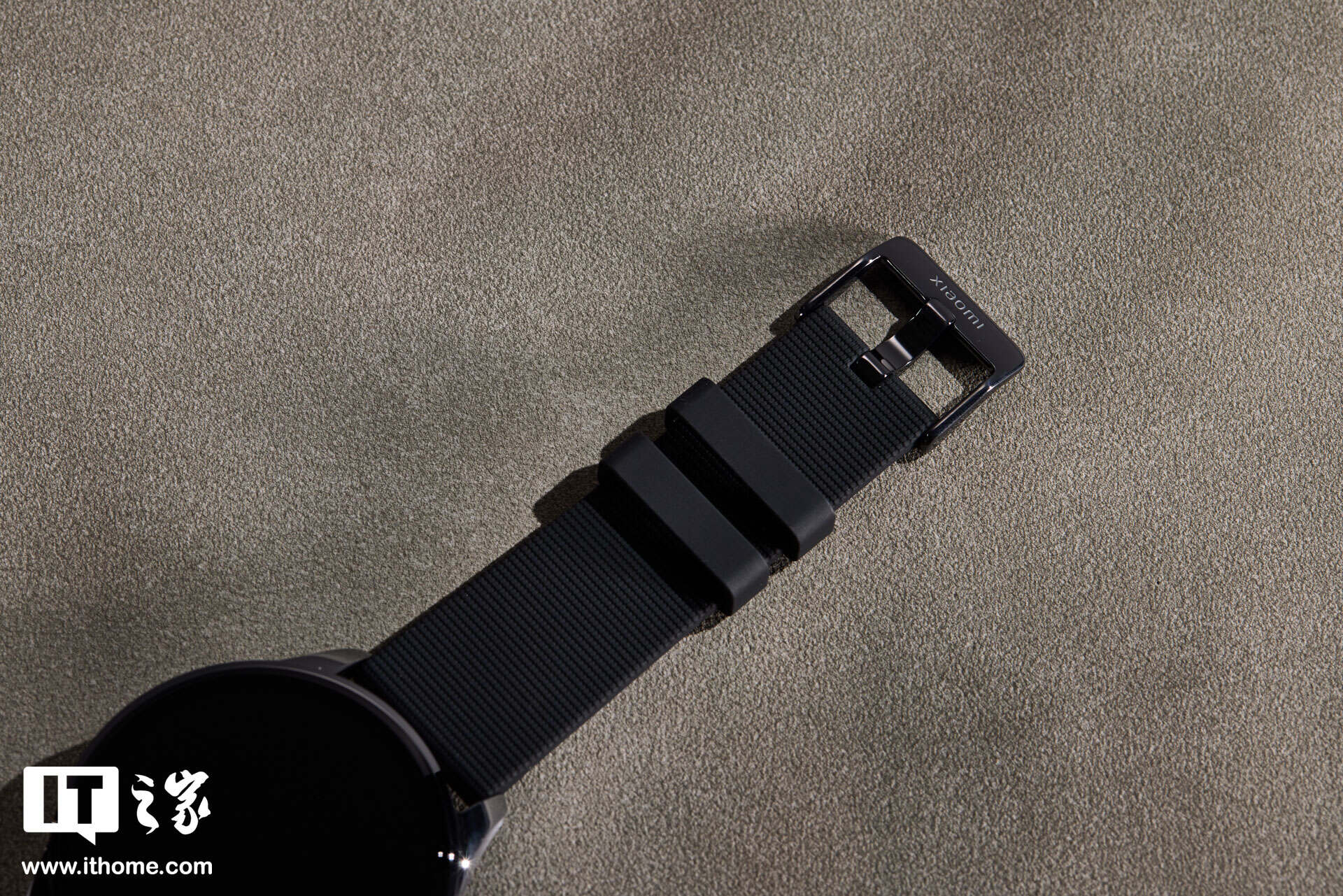 IT之家这次实拍的是氟橡胶版本,表带上还有密集的类织布纹理,搭配黑色的表身,整机的“商务运动(运动、商务场景均适配)”感还是相对不错的。