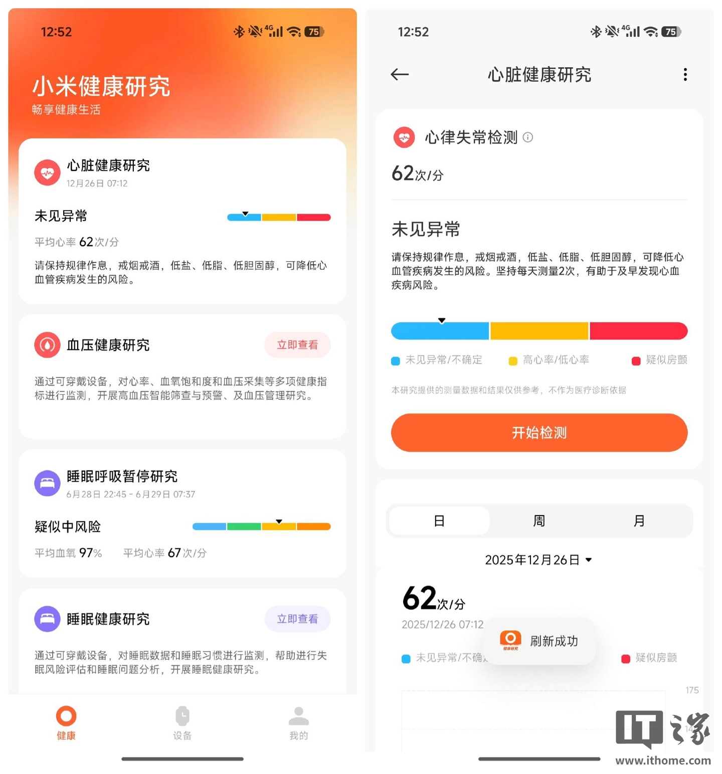 还有小米健康研究,目前小米 Watch 5 支持心脏健康研究、睡眠呼吸暂停研究、睡眠健康研究等等。其中血压健康研究需要先通过上臂式血压计进行校准,然后需要连续多日佩戴,随后开展高血压智能筛查和预警。