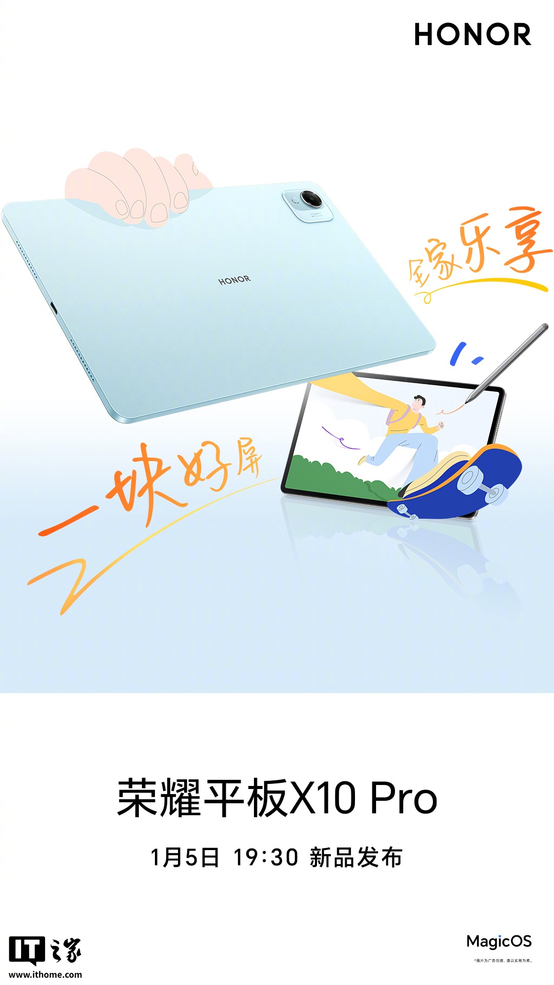 IT之家 12 月 29 日消息,荣耀官方今天宣布 X10 Pro 平板将在 1 月 5 日 19:30 与 Power 2 手机一同发布,新机将搭载 11.5 英寸 2.5K 护眼屏,配备全金属一体机身。