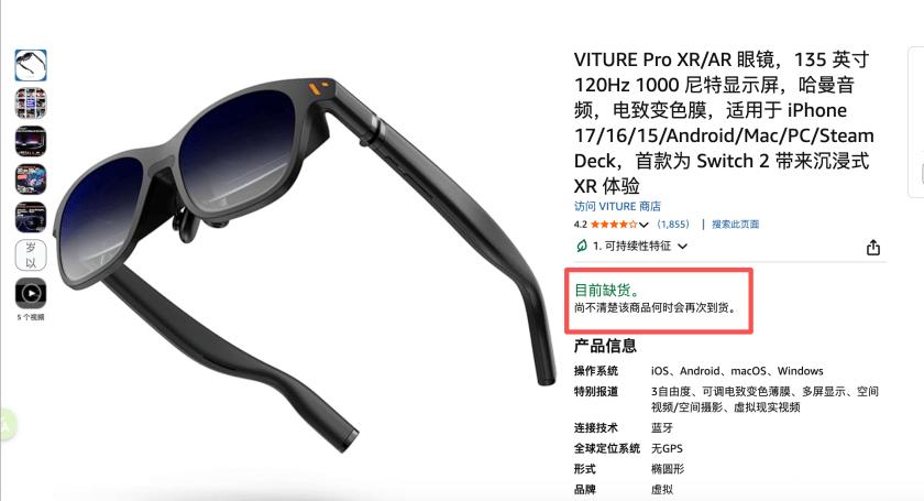 市象观察线上销售平台发现,截至12月27日,在亚马逊德国站点搜索“VITURE Pro”显示“目前缺货,尚不清楚何时会再次到货”,但Luma系列产品仍在售。同时VITURE Pro、Luma系列在亚马逊欧洲其他地区均处于在售状态。