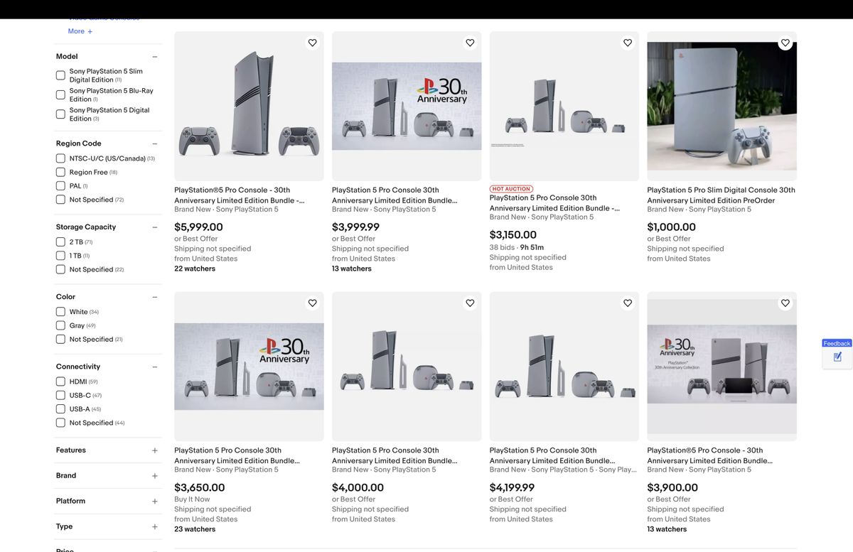 PS5 Pro 在 eBay 上的售价约为 1000 美元,比索尼的售价高出了近 43%。PS5 Pro 30 周年纪念版的价格更是令人瞠目结舌,大多数售价都在 3000 美元(IT之家备注:当前约 20999 元人民币)以上,比原价高出了 200%,甚至有人要价 12300 美元。