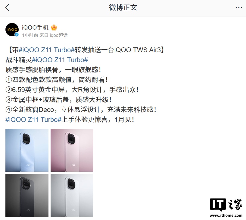 IT之家 12 月 30 日消息,iQOO 手机官方今日公布了 iQOO Z11 Turbo 四款配色的外观,包括沧浪浮光、光晕粉、极夜黑、天光白,新机将在明年 1 月发布。