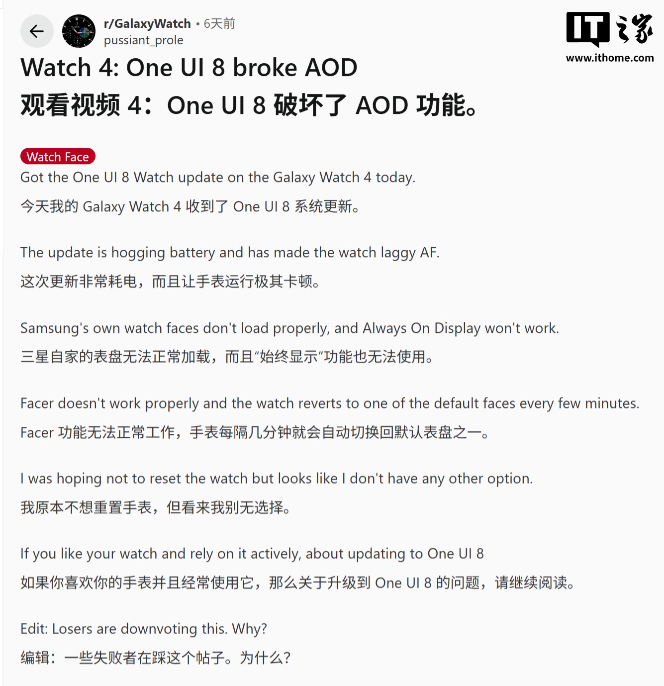除传感器故障外,系统稳定性也出现了大幅退坡。Reddit 等社区的用户反馈显示,更新后的手表出现了严重的电池耗电异常,续航能力断崖式下跌。