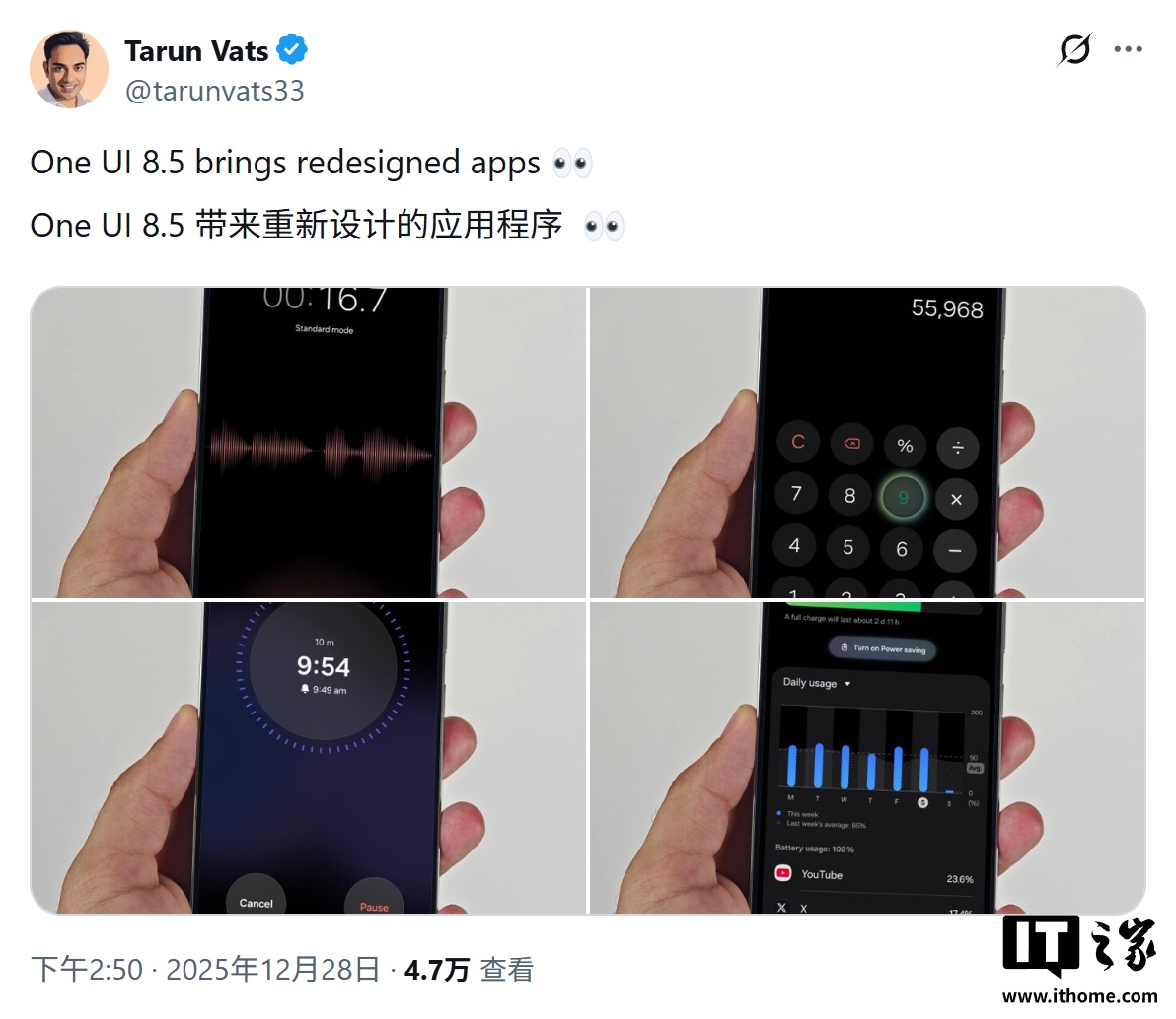 IT之家查询消息源推文,附上其它相关 One UI 8.5 应用新版 UI 如下: