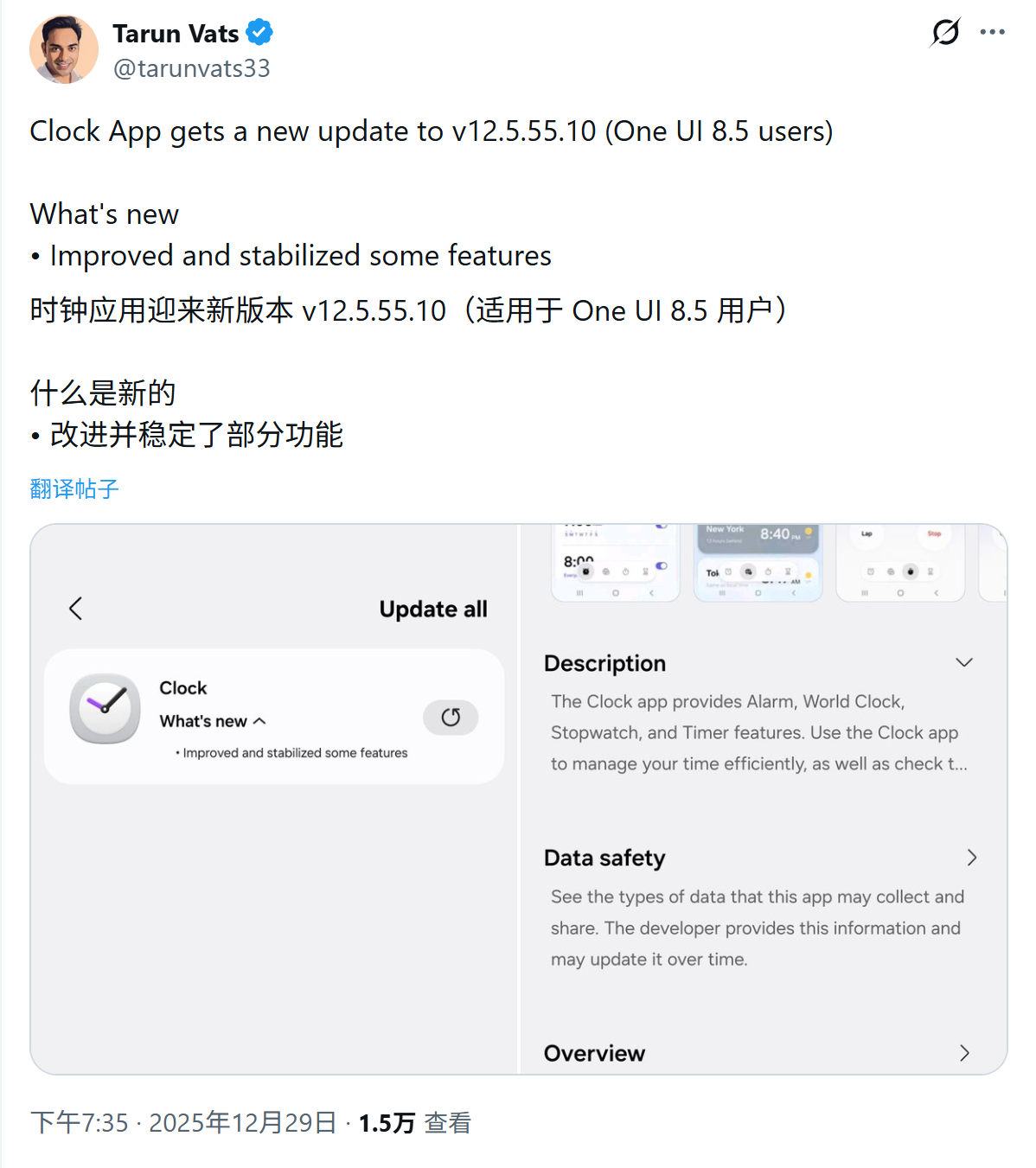 IT之家 12 月 30 日消息,消息源 Tarun Vats 于 12 月 28 日在 X 平台发布推文,称三星近期向 One UI 8.5 测试版用户推送了时钟(Clock)应用更新,版本号为 12.5.55.10,安装包大小约 56.17MB。