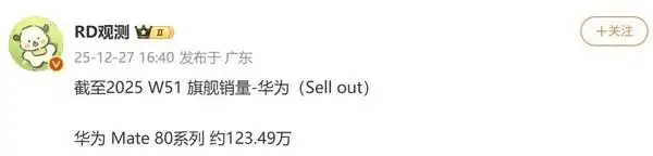 数码博主RD观测日前公布了截至2025年W51(2025年第51周,即12月14日至20日)的旗舰销量,华为Mate 80系列约123.49万台,而其开售时间是11月28日。若消息属实,这意味着创下如此佳绩仅仅花了23天时间,相当于平均每天销售5万台以上。