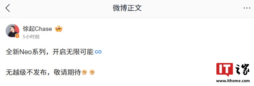 IT之家 12 月 30 日消息,真我 realme 副总裁、全球营销总裁、中国区总裁徐起今日官宣将推出全新 Neo 系列机型,号称“无越级不发布”。
