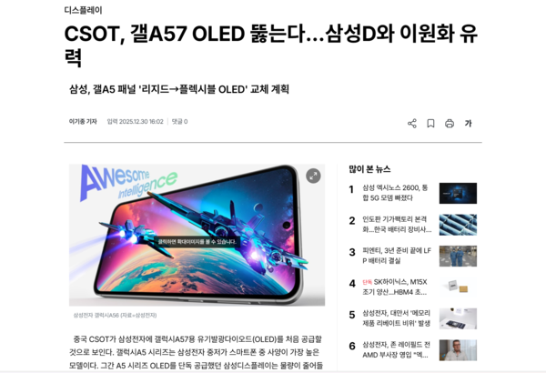 因此,三星的目标是在为A57升级柔性OLED的同时,将成本上升幅度最小化。在近期存储器等零部件价格上涨的背景下,控制成本对三星和供应商都至关重要。据悉,三星电子要求以接近此前刚性OLED的价格供应A57所用的柔性OLED,而CSOT提出了相对更具竞争力的报价。对三星而言,柔性OLED价格的下降有助于其将这类屏幕更广泛地应用于中端机型。