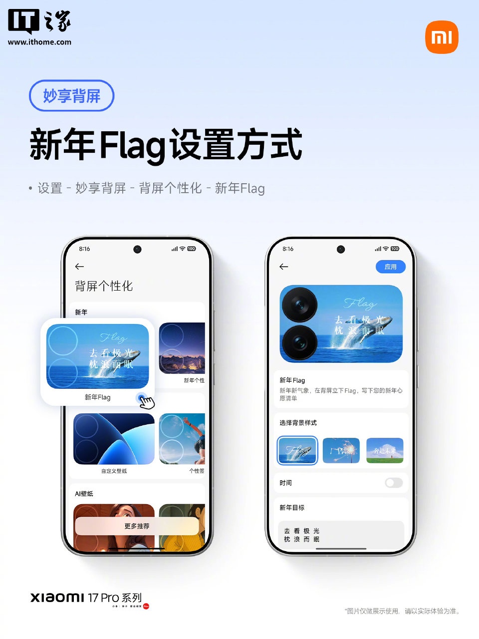 IT之家 12 月 31 日消息,据小米手机官方微博,小米 17 Pro 系列手机“妙享背屏”现已正式上线“新年 Flag”模板,用户可以在背屏中记录自己的 2026 年目标。
