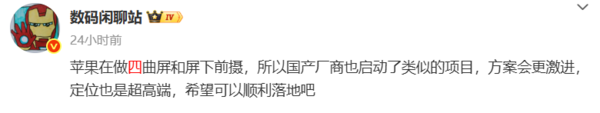 超高端市场的差异化占位也是重要考量。当前安卓主流旗舰集体回归直屏,曲面屏已退出大众赛道,苹果选择四曲屏方案,既能避开大众市场对曲面屏实用主义的争议,又能在超高端领域建立技术壁垒,进一步强化“引领未来”的品牌认知。