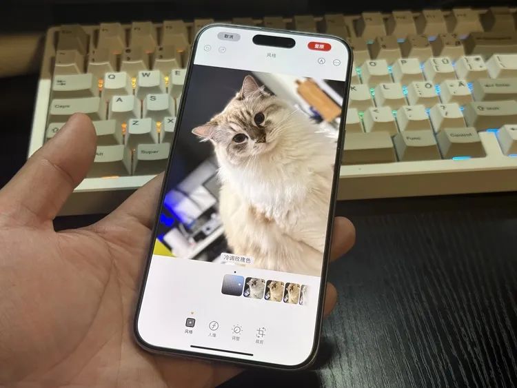 同步到 iPhone 15 Pro 的照片,点击编辑后,同样能够调用这一整套全新的摄影风格编辑页面。倘若你的朋友“修”出了一张你极为喜欢的风格照片,你完全可以让他将这张照片发给你,然后通过“拷贝编辑点”的方式应用这套色彩模板。