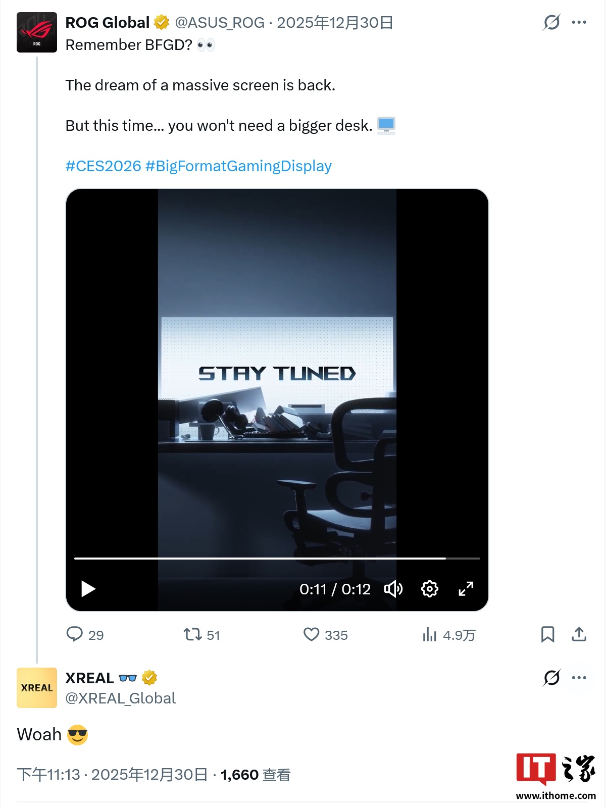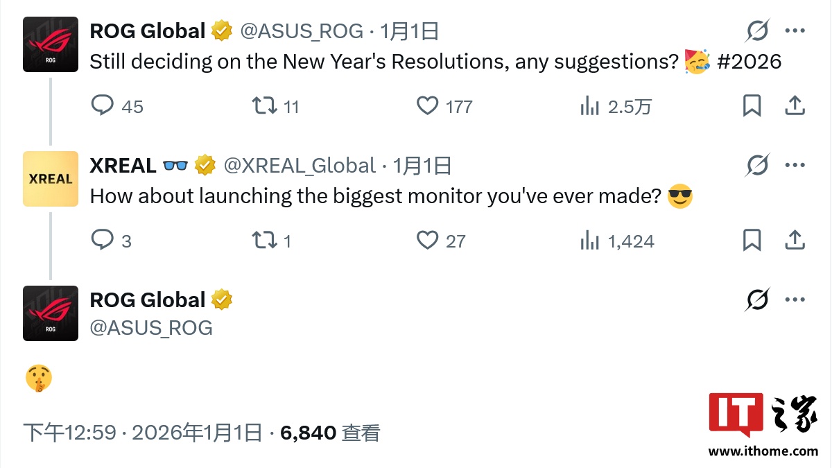 IT之家 1 月 3 日消息,华硕 ROG 官方 2025 年 12 月 30 日在社交平台发布了一段预热视频,表示 BFGD 概念即将得到复兴,而这次不需要更大的桌子。在相关动态下方,XR 智能眼镜厂商 XREAL 进行了回复。