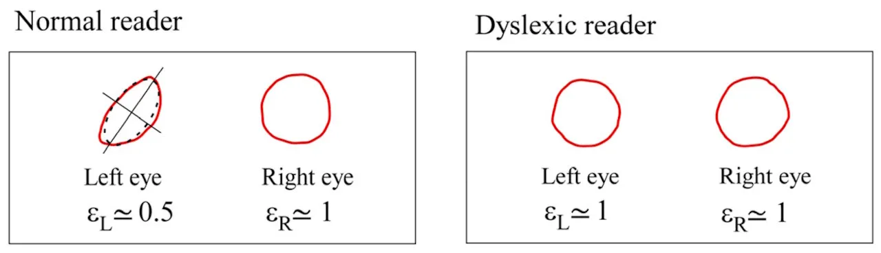 普通人主视眼的 Maxwell's centroids 中心通常呈圆形,而非主视眼则多呈椭圆形;但阅读障碍者的两只眼睛一般都呈对称,导致左右眼不能形成足够的残像,进而导致阅读文字时出现镜像、重影。