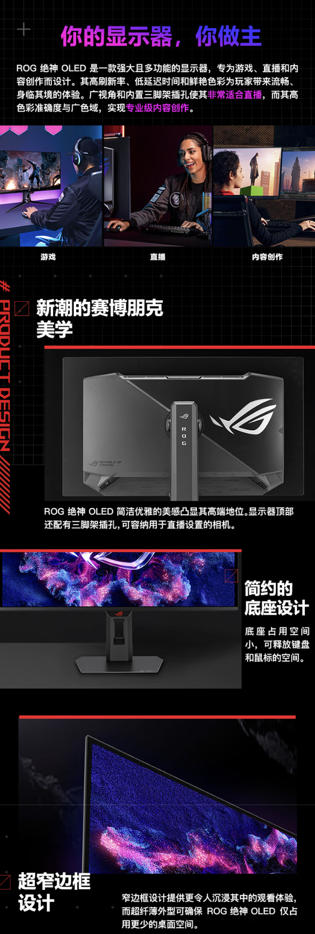 该产品配备一块 2560x1440 分辨率 240Hz QD-OLED 面板,显示器典型亮度 200 尼特,HDR 亮度 400 尼特,GtG 响应速度 0.03ms,显示器支持 10-Bit 色彩,覆盖 99% DCI-P3 色域。