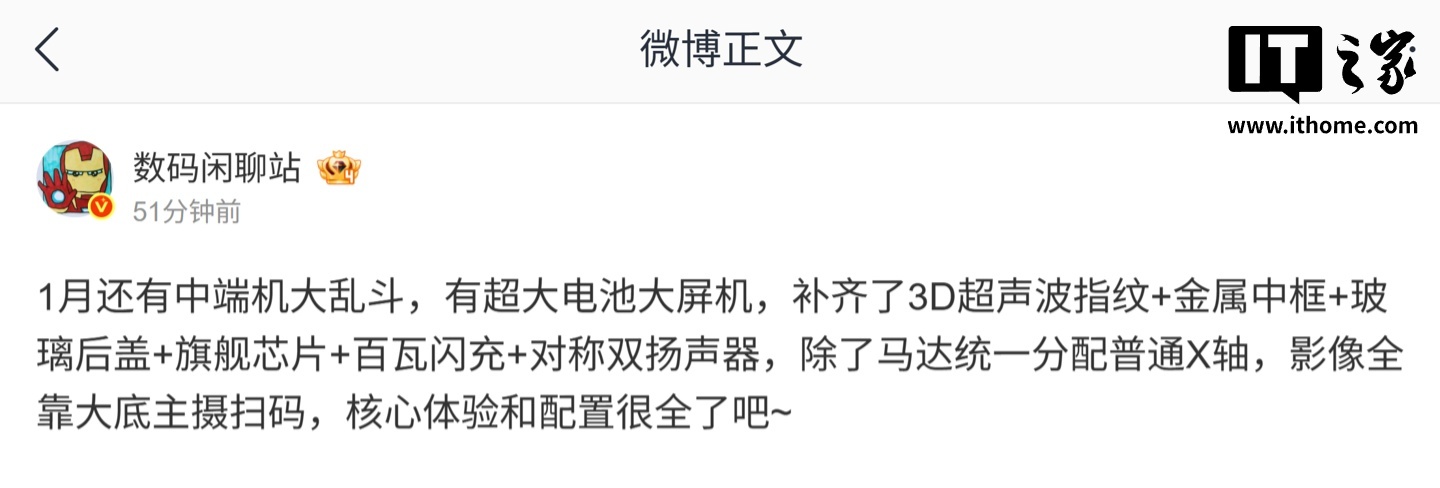博主 @数码闲聊站 则透露,多家厂商 2026 年 1 月开启的“中端机大乱斗”还有一台超大电池大屏机。
