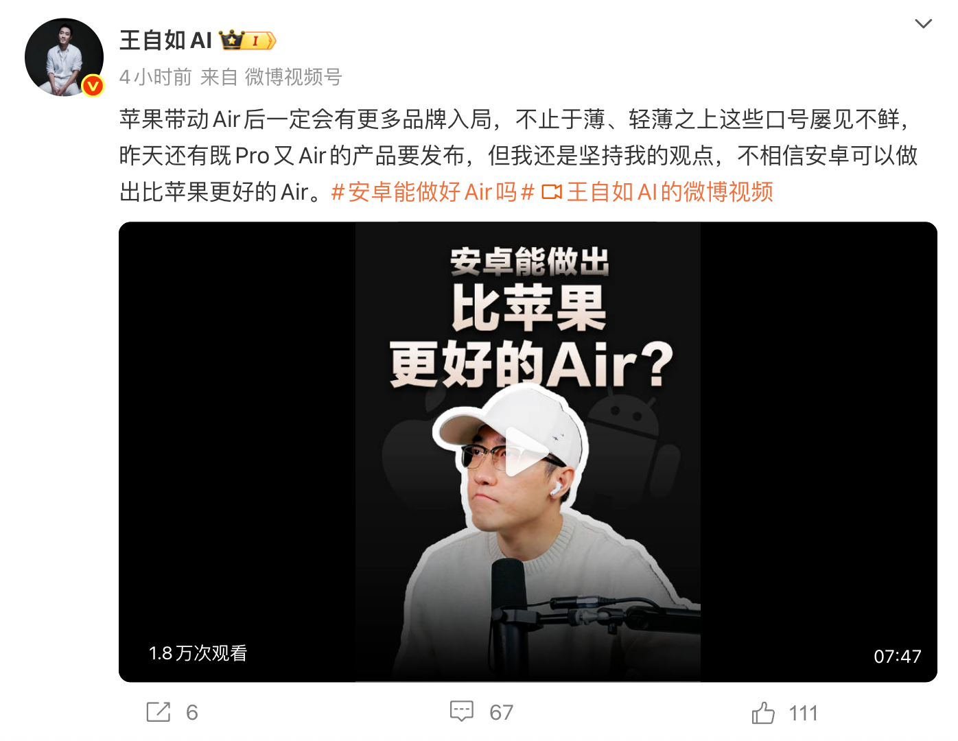 今天,王自如发文:“苹果带动Air后一定会有更多品牌入局,不止于薄、轻薄之上这些口号屡见不鲜,昨天还有既Pro又Air的产品要发布,但我还是坚持我的观点,不相信安卓可以做出比苹果更好的Air。”