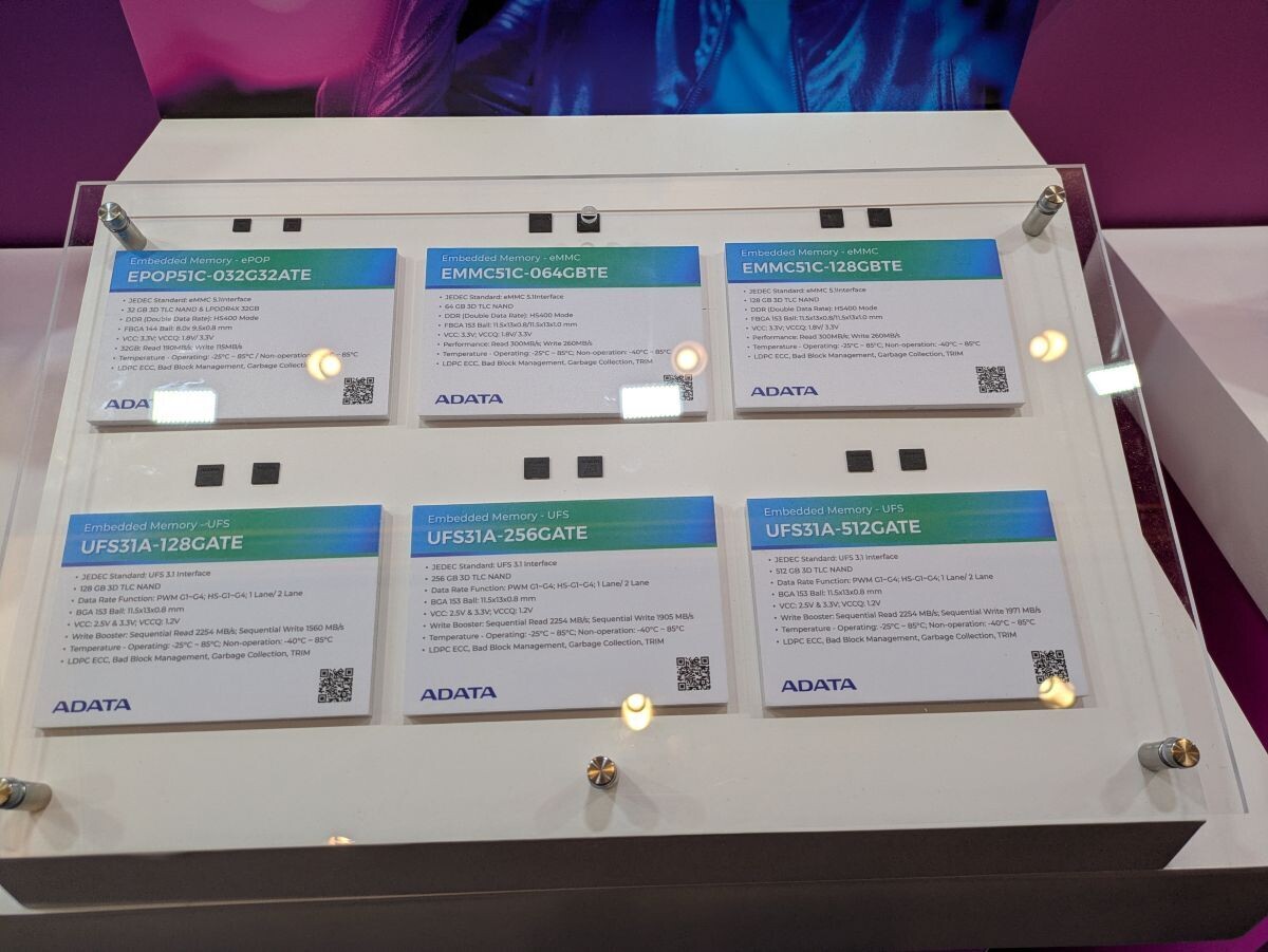 其内部包含 32 GB 的 3D TLC NAND 闪存与 32 GB 的 LPDDR4X 内存(HS400 模式),存储部分提供 190 MB/s 的读取与 115 MB/s 的写入速度。同时展出的还有型号为 EMMC51C-128GBTE 的 128 GB 独立 eMMC 封装产品,读写速度分别为 300 MB/s 和 260 MB/s。
