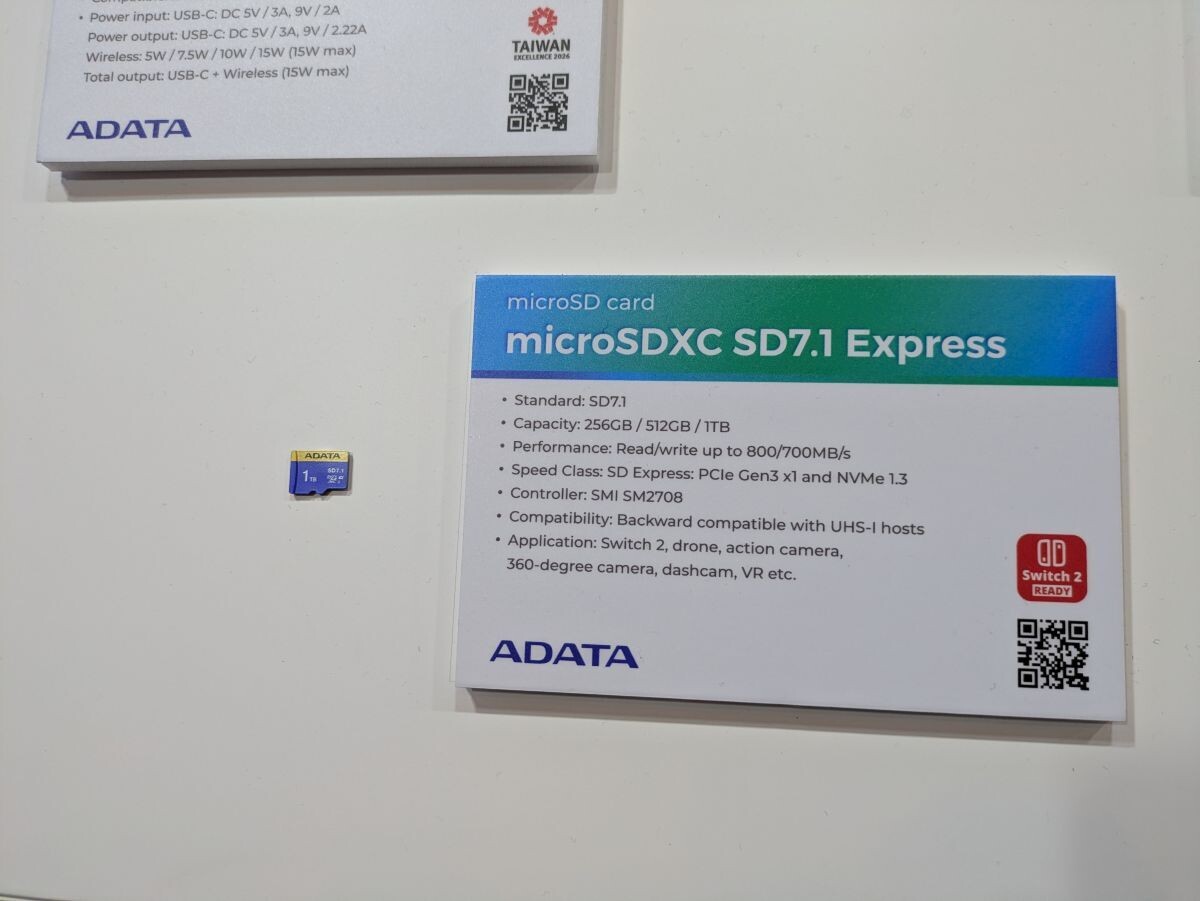 针对小型移动设备市场,威刚推出了新款 microSDXC 存储卡。IT之家援引博文介绍,该产品采用 SD 7.1 标准及 SD Express PCIe Gen 3 x1 接口,同样搭载 SM2708 主控芯片,容量覆盖 256GB 至 1TB,连续读取速度达到 800 MB/s,写入速度可达 700 MB/s。