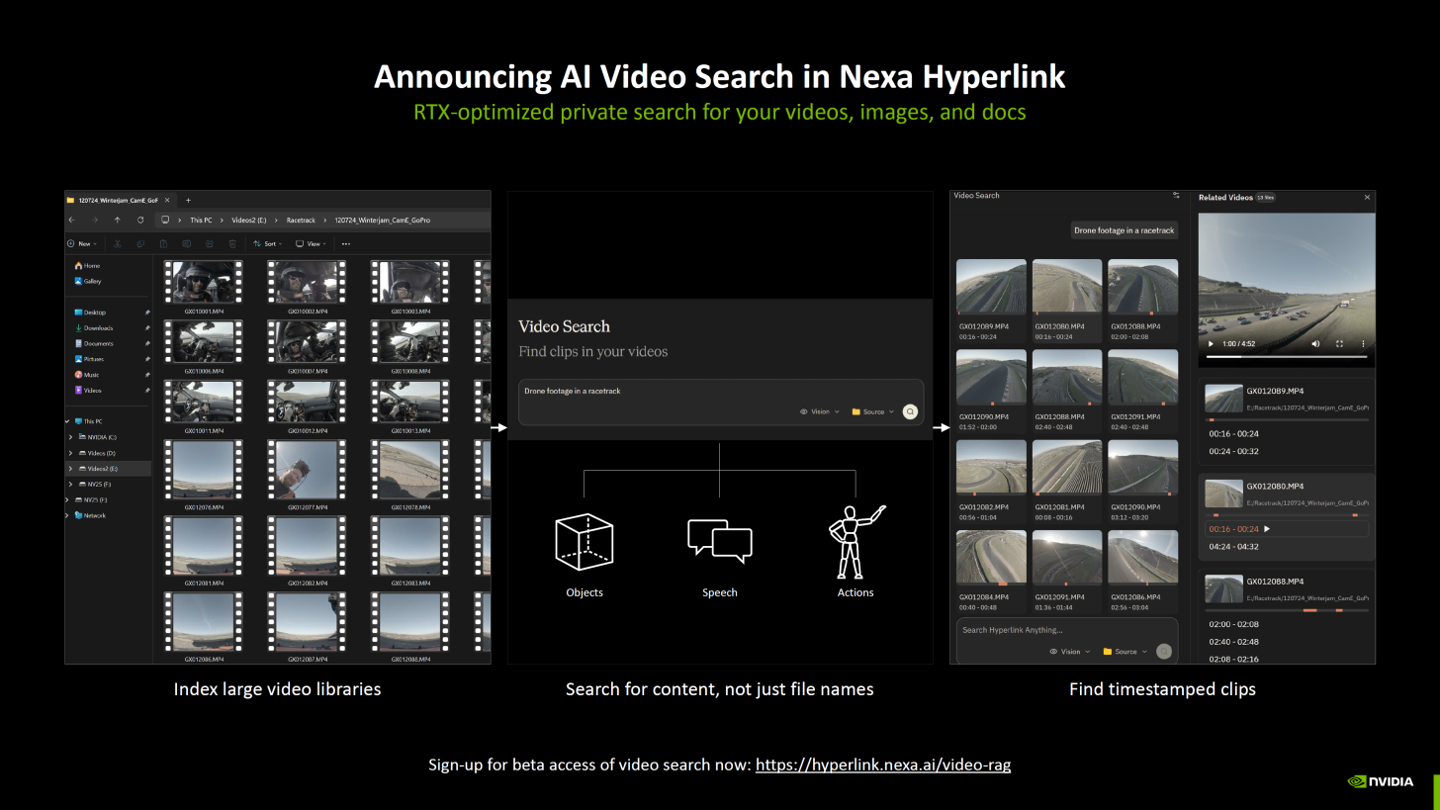 除了性能优化,英伟达还将 AI 视频搜索功能引入 Nexa Hyperlink。用户现可利用 RTX 优化的私有搜索功能,快速检索本地的视频、图像和文档。