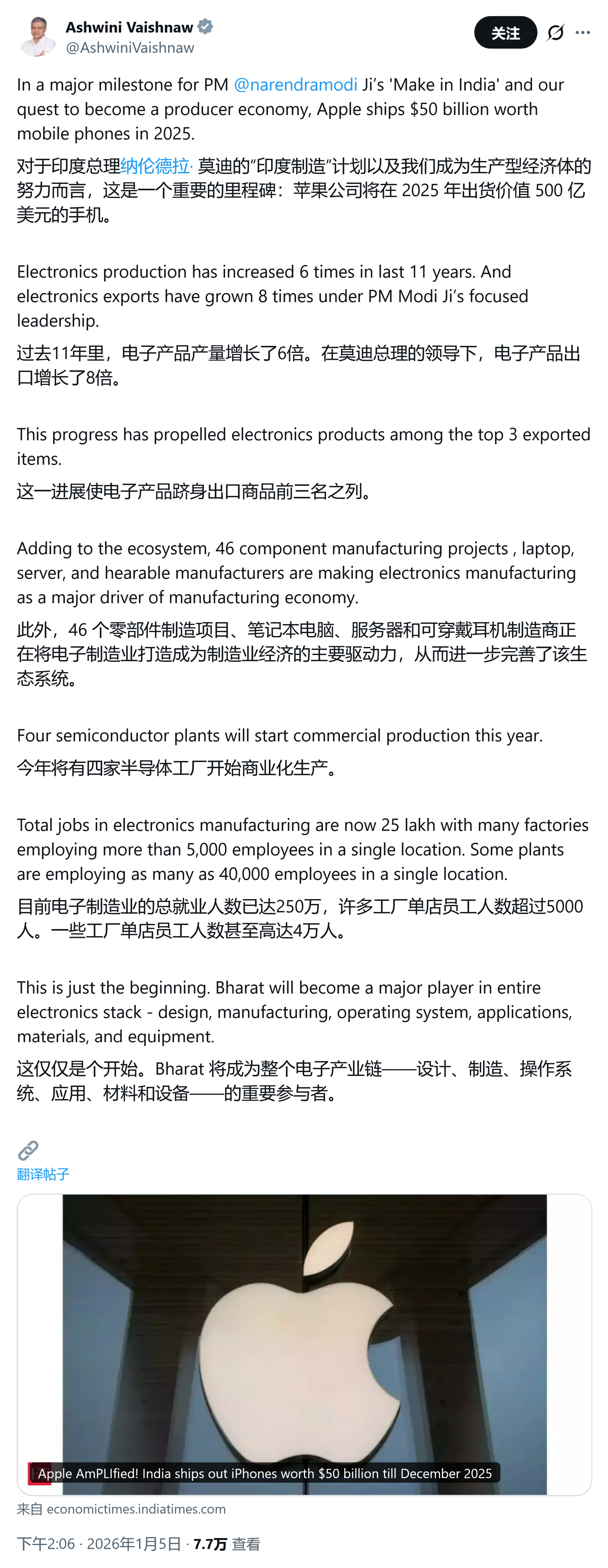 针对《经济时报》的报道,印度铁道、信息与广播、电子与信息技术部长阿什维尼・瓦伊什纳夫在 X 平台上表示,500 亿美元是一个“重要的里程碑”,他将这一成就归功于政府的“印度制造”计划,并表示“过去 11 年里,电子产品产量增长了 6 倍”。