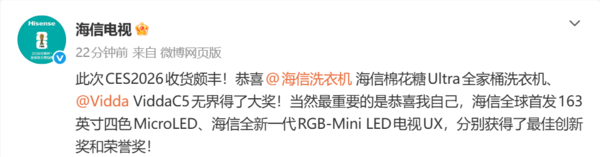 【CNMO科技消息】1月6日,海信官方在社交媒体上宣布,在CES2026展会上,海信全球首发163英寸四色MicroLED和海信全新一代RGB-Mini LED电视UX,分别获得了最佳创新奖和荣誉奖!