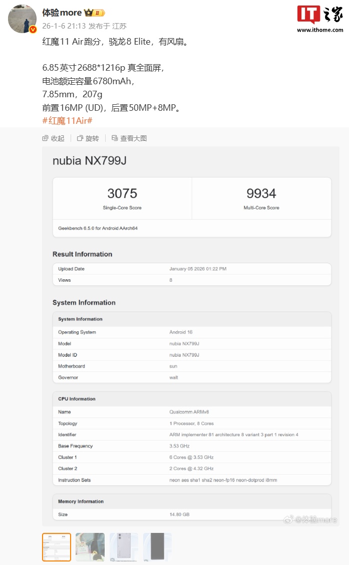 IT之家 1 月 6 日消息,型号为“nubia NX799J”的红魔 11 Air 新机 Geekbench 跑分已曝光:单核 3075 分、多核 9934 分,博主 @体验more 透露了该机部分配置信息:
