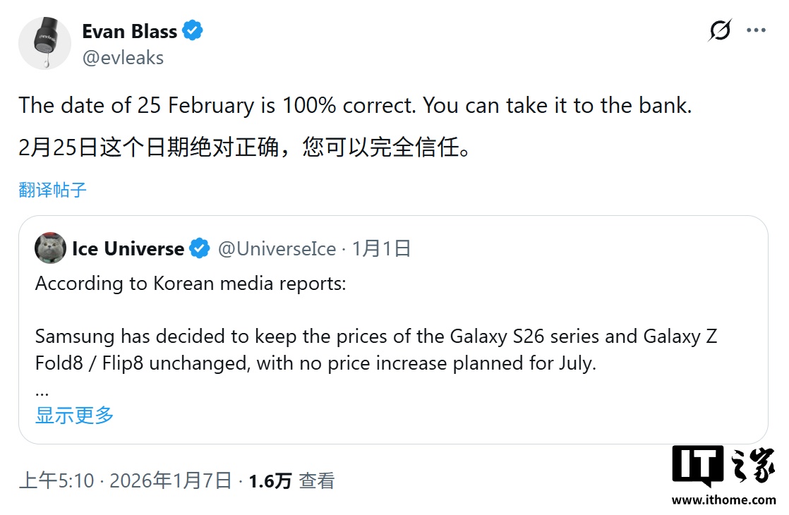 IT之家 1 月 7 日消息,消息源 @Evleaks 今天(1 月 7 日)发布推文,爆料称三星计划 2026 年 2 月 25 日在美国旧金山举办 Galaxy Unpacked 发布会,届时将推出 Galaxy S26 系列手机。