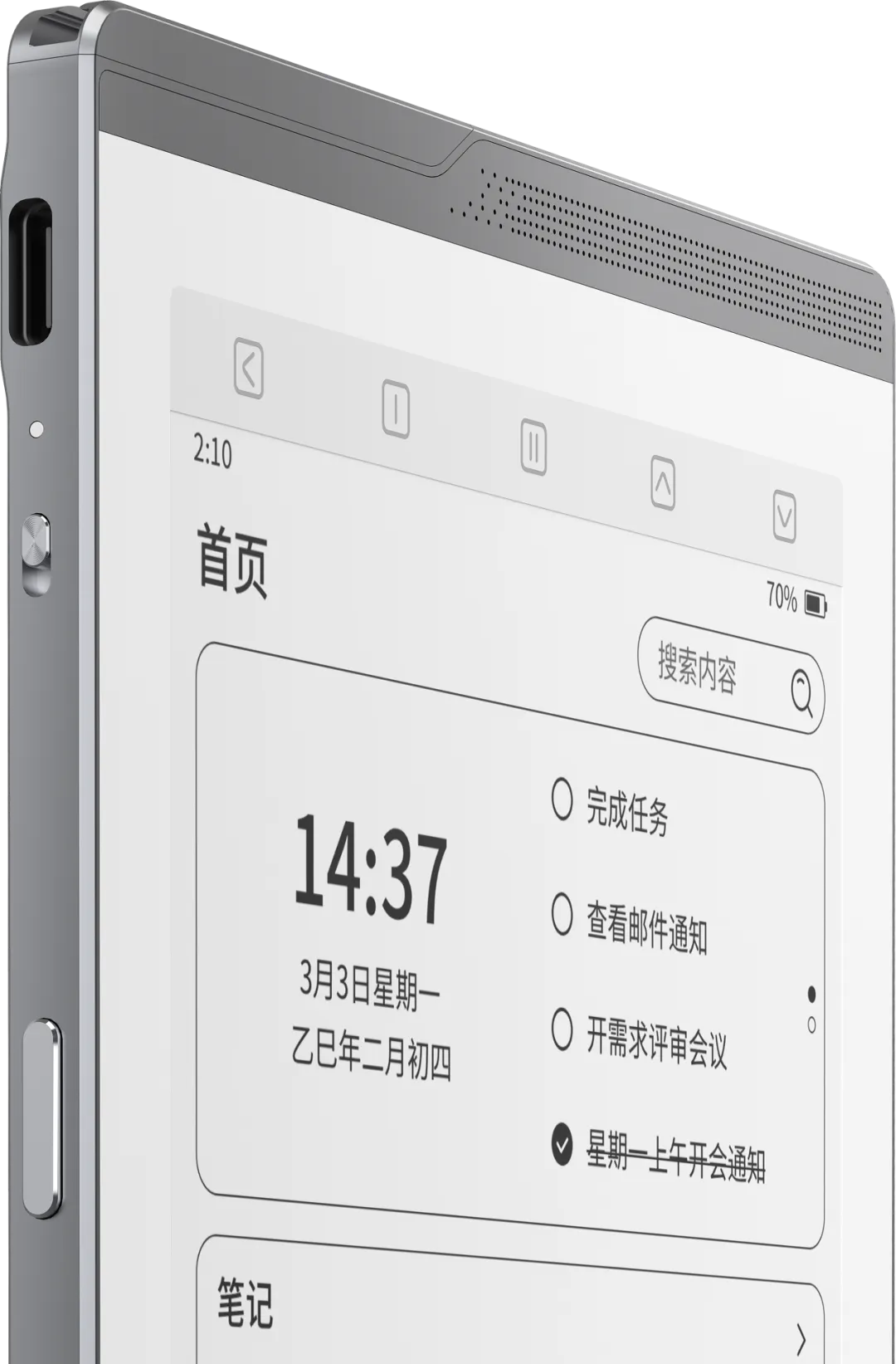 从官方发布的渲染图来看,M6 系列电纸书搭载银色金属边框,正面覆盖一块大尺寸 E-ink 屏幕,顶部还带有实体快捷键以及扬声器开孔装饰。