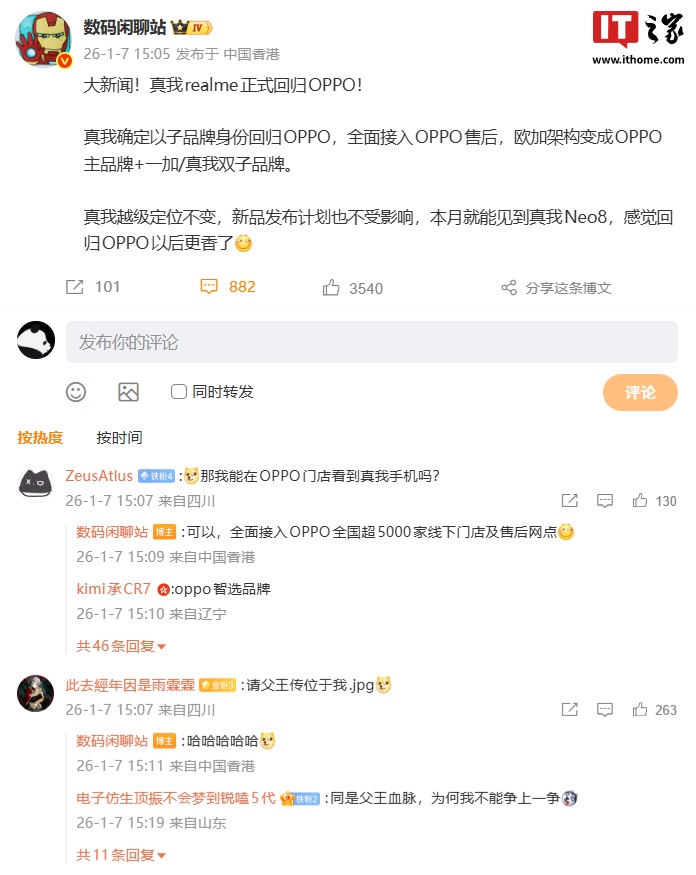 IT之家 1 月 7 日消息,今天下午有消息称,realme 将回归 OPPO 成为其旗下的子品牌。未来,realme、一加两个子品牌将与 OPPO 主品牌形成战略协同,形成差异化打法。