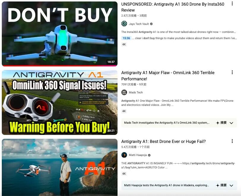 影石在社交平台上发现,大量差评使用相同的“客服沟通截图”,以证明“拒绝退货”;原本专注美妆、母婴、穿搭的账号,开始密集发布无人机差评;甚至部分新注册账号,几乎只围绕影翎 A1 进行负面输出。