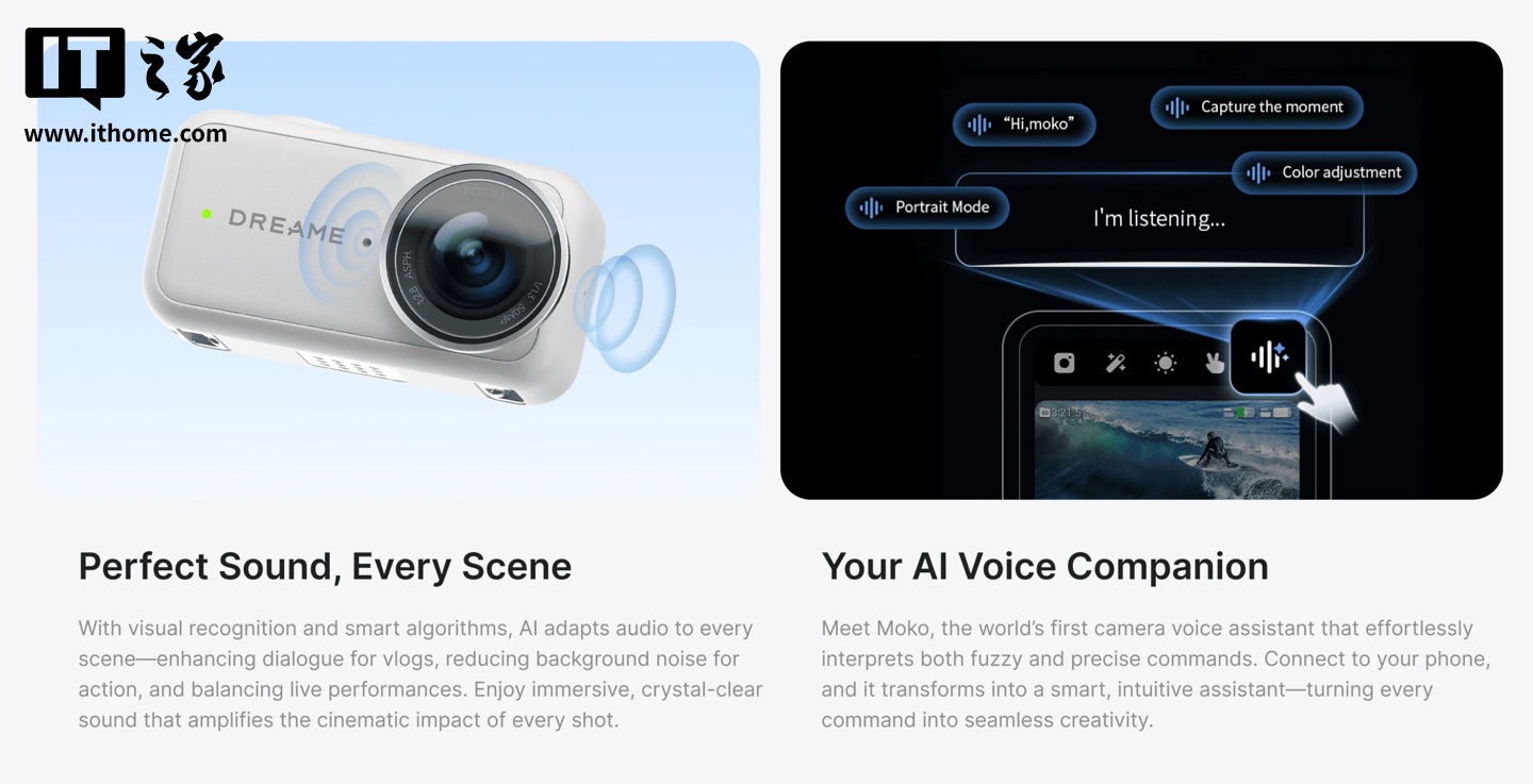 此外,这款运动相机内置一颗 4nm 芯片,支持语音指令操作、人声音量增强等 AI 功能,摄像头模块内置 64GB/128GB 存储空间,屏幕模块则带有 microSD 卡槽,支持插入 1TB 存储卡,合体续航可达 200 分钟,单体续航则为 90 分钟。