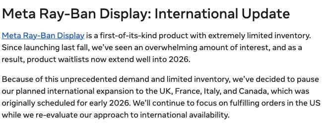 Meta宣布,由于Meta Ray-Ban Display上市以来市场反响异常热烈,需求远超预期,公司决定暂停原计划于2026年初推进的国际市场扩张,优先履行美国市场的订单。