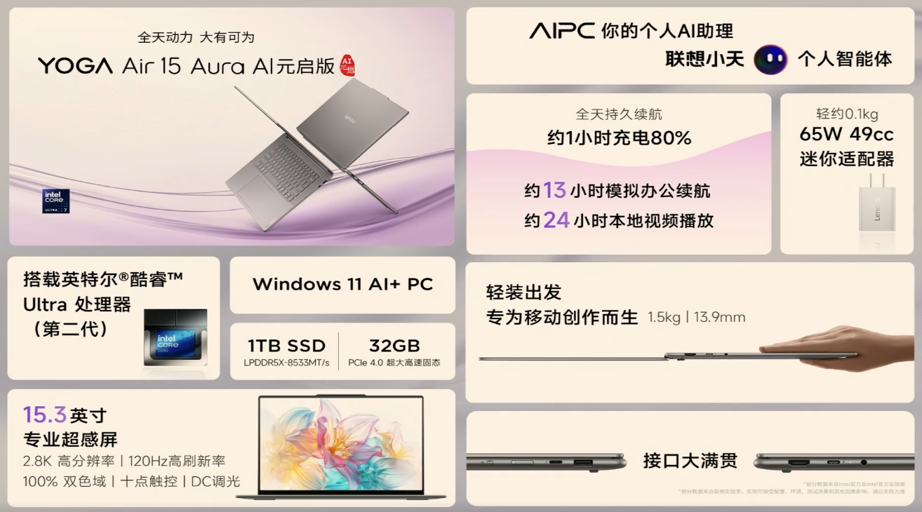 联想官方透露,YOGA Air 15 Aura AI 元启版搭载了联想最小笔记本主板,主板尺寸比手机尺寸还要小。