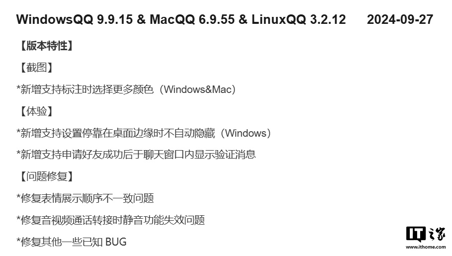 IT之家 9 月 29 日消息,腾讯 QQ 更新 Windows 9.9.15、macOS 6.9.55、Linux 3.2.12 版本,新增支持设置停靠在桌面边缘时不自动隐藏(Windows)等功能。