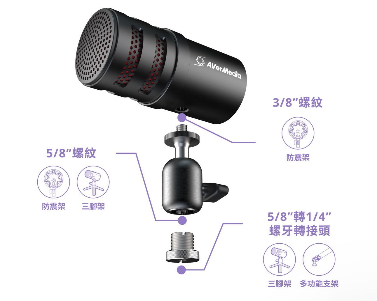 VERSATI go 顶部主体采用 3/8 英寸螺纹,底部采用 5/8 英寸螺纹与自带可旋转三角支架连接,还配备了 5/8 转 1/4 螺牙接口,兼容大部分支架设备,可将麦克风固定在最理想的位置。