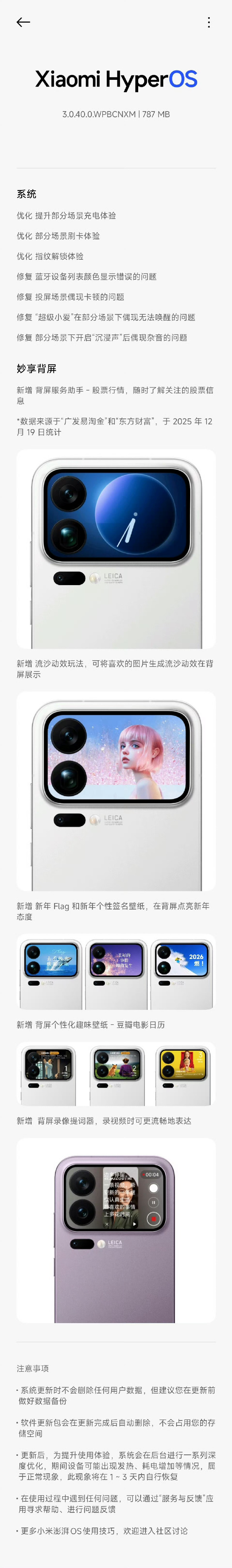 凤凰网科技讯 1月8日,Xiaomi HyperOS 3.0.40.0.WPBCNXM版本开始向用户推送,系统更新后,小米17 pro系列的背屏将新增录像提词器等功能,该功能可以帮助用户在录视频时更流畅的表达。此外新版本还新增了股票行情、流沙动效、新年flag和新年个性签名壁纸等功能。