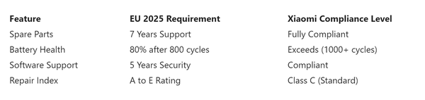 为满足欧盟《生态设计法规》(EU 2023/1670 和 2023/1669)自2025年6月起实施的要求,小米已对小米17系列、小米15T系列及REDMI Note 15系列等机型进行针对性优化,重点提升设备耐用性、关键零部件可获取性及整体可维修性,以延长产品生命周期。