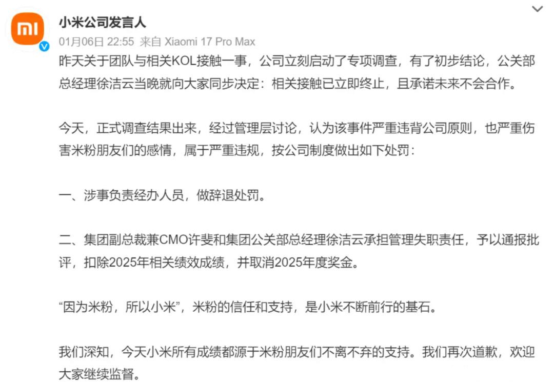 当日晚,小米公关部总经理徐洁云发文致歉,承认团队曾与该KOL接触,立即终止所有合作并承诺“永不合作”;1月6日,小米发布正式调查结果,认定事件“严重违背公司原则、伤害米粉感情”,对涉事经办人员予以辞退,对集团副总裁兼CMO许斐、公关部总经理徐洁云通报批评并扣除2025年绩效及年度奖金(网传百万级奖金);1月7日,雷军在直播中回应,雷军在直播中明确回应:这件事的严重性不在于KOL批评小米或得罪米粉,而是“这个KOL一直在攻击贬低米粉、诅咒米粉”。他强调,小米要站出来保护用户,这是公司的底线。