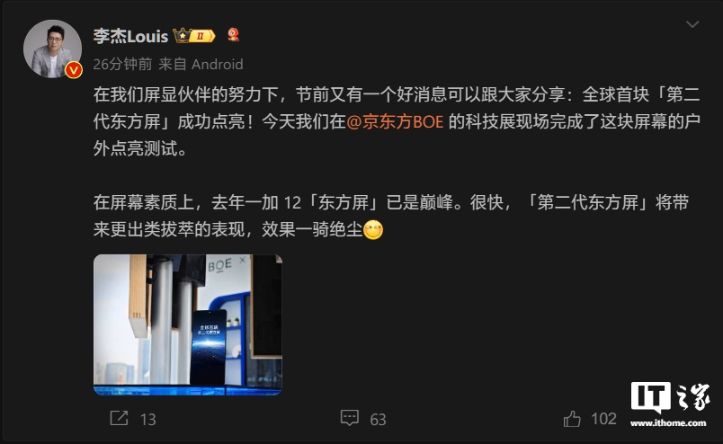 IT之家 9 月 29 日消息,今天傍晚,一加中国区总裁李杰在微博发文宣布,全球首块“第二代东方屏”成功点亮,一加方面今天在京东方 BOE 的科技展现场完成了该屏幕的户外点亮测试。